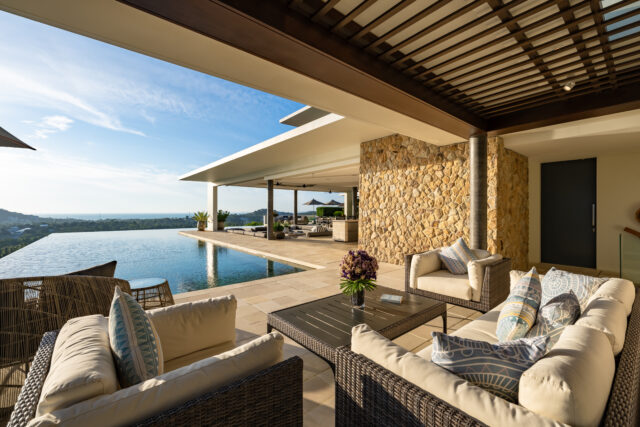 The villa’s centrepiece is its horizon-edge infinity pool, flanked by sun terraces, shaded lounges, and a rooftop deck. A poolside BBQ sala and al fresco dining spaces make it perfect for long lunches and starlit evenings. Indoors, an air-conditioned seaview lounge and open living areas provide comfort and style in equal measure.